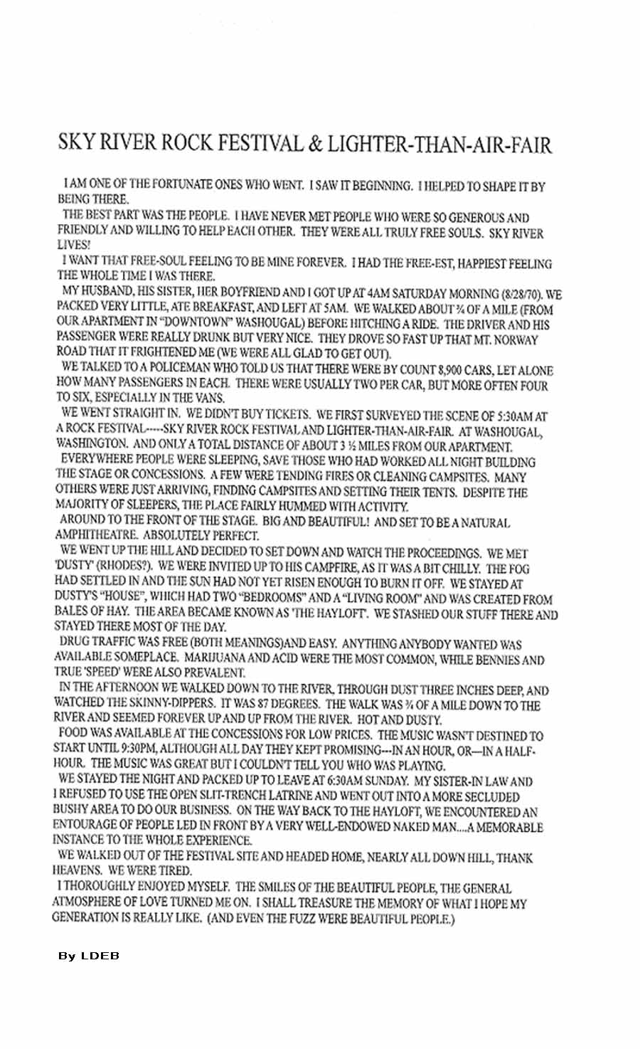 It was a first in many ways for me. I was 22 at the time, and admittedly not very worldly or informed as to the ways of life and living. I had some very good friends who had been to every Sky River since Betty Nelson's farm, and they were hell bent to break me out of my cloistered shell of a life.